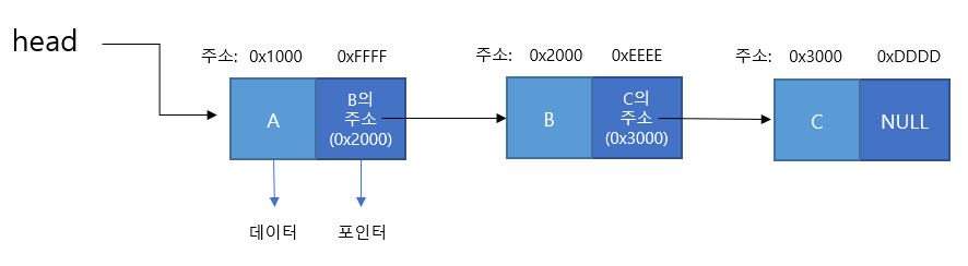 - 각 노드는 다음 노드를 가리키는 포인터를 포함한다. 다음 노드를 가리키는 포인터는 다음 노드의 주소 값을 갖고 있다. 각 포인터 변수의 주소도 따로 존재한다.